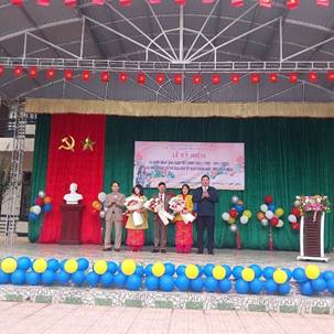 Lãnh đạo chính quyền địa phương và phụ huynh tặng hoa chúc mừng nhà trường